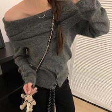 cammello 웨이스트 버튼 루즈핏 오프숄더 니트 티셔츠 긴팔 니트티