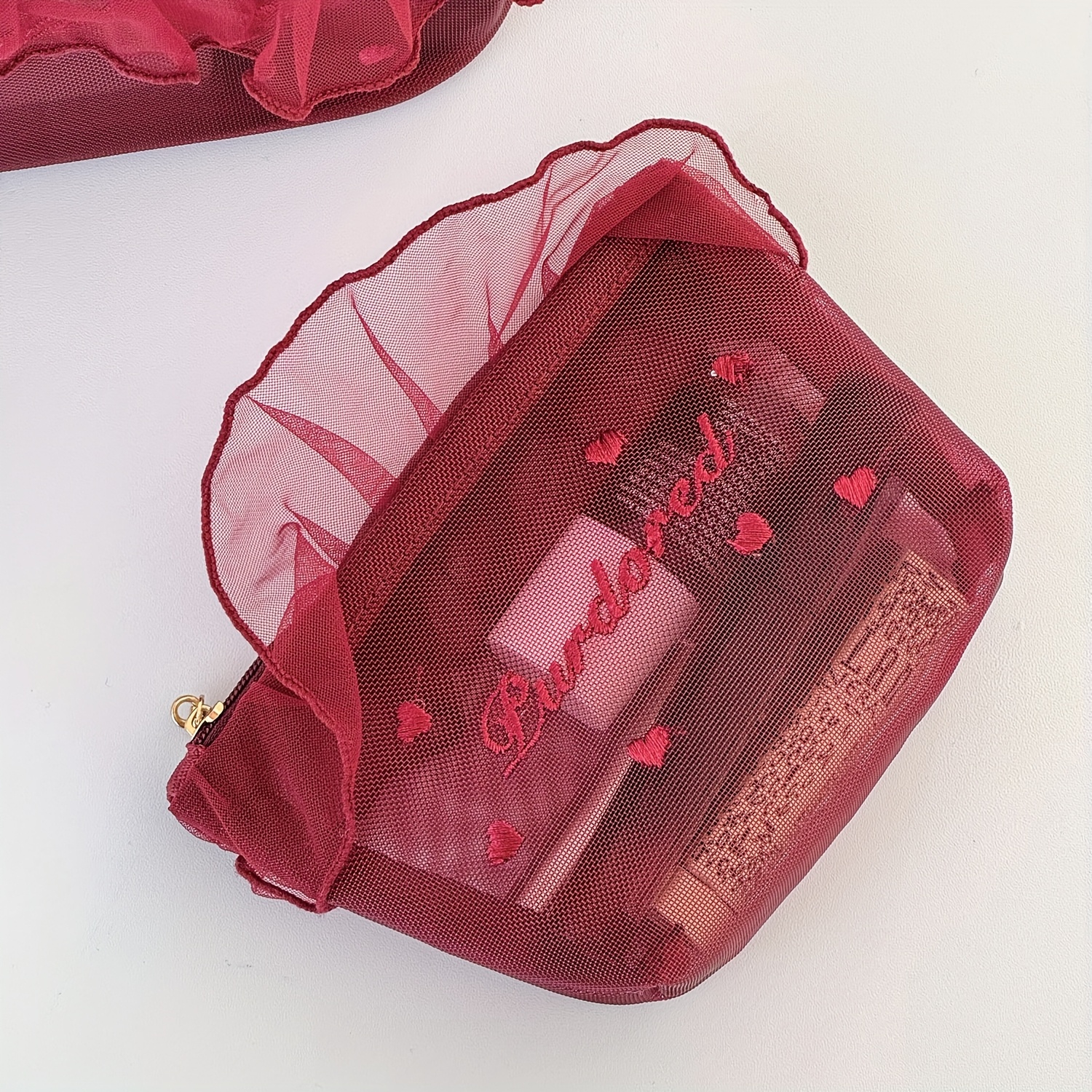 TEMU 러플 디테일과 러브 자수가 있는 정제된 레드 메쉬 메이크업 백 1개 - 소녀들을 위한 귀여운 휴대용 화장품 정리함, 여행이나 일상 사용에 완벽한 가벼운 나일론 세면도구 가방, 선물로도 좋은 투어릿 포치 | 러플 엣지 디자인 | 안전한 지퍼 클로저, 작은 화장품 가방