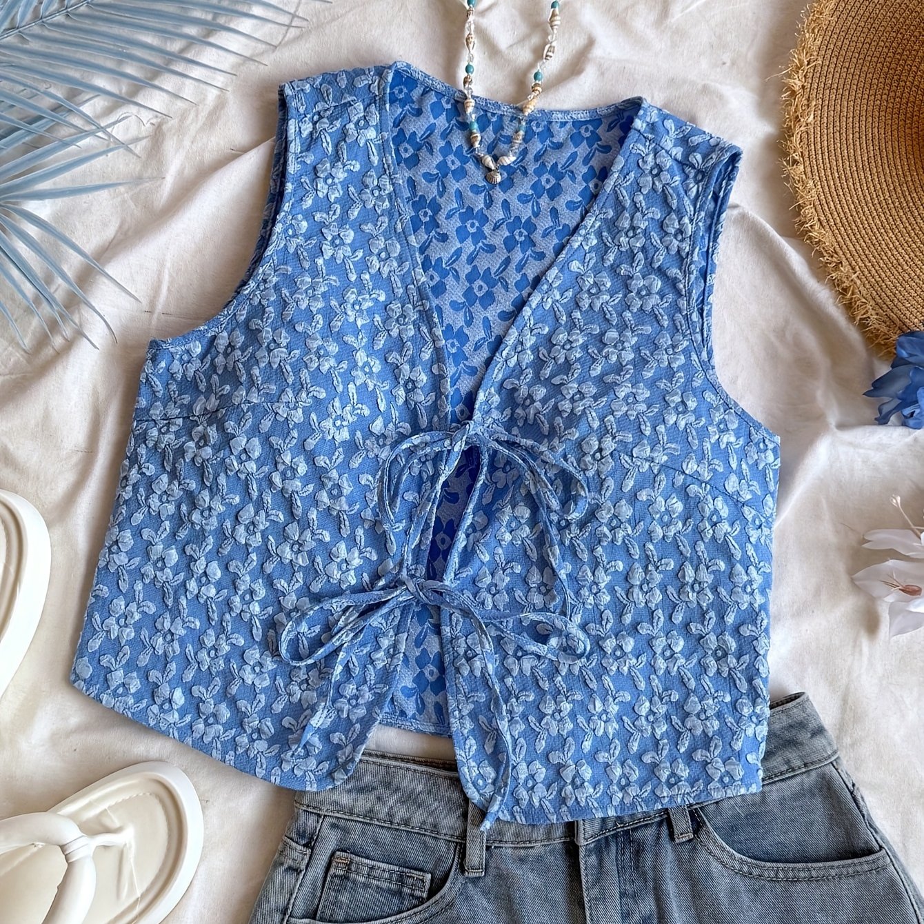 TEMU 우아한 화이트 민소매 조끼, 꽃무늬 질감 및 뒷면 묶음 디테일 - 휴가 스타일, V넥, 레이스업 프론트, 해변 또는 캐주얼 외출에 완벽, 해변 의상|휴가 스타일 조끼|레이스업 디테일, 해변 옷