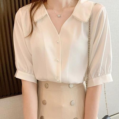 [엄지척]진주 버튼 쉬폰 여성 V넥 하객룩 블라우스_19645254_667501