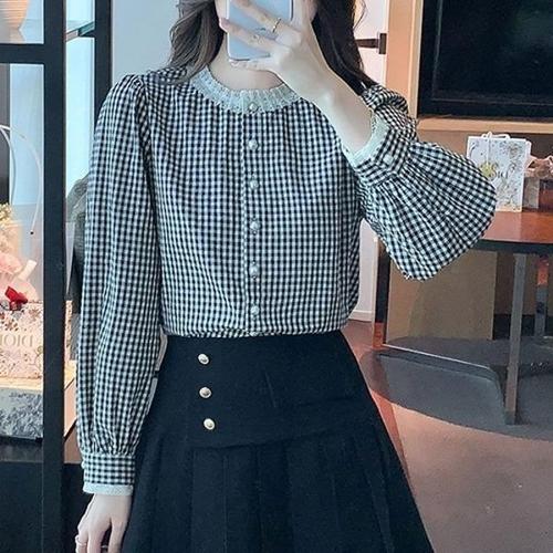 [끌레아]체크패턴 블라우스 레이스포인트 어깨셔링 직장인룩