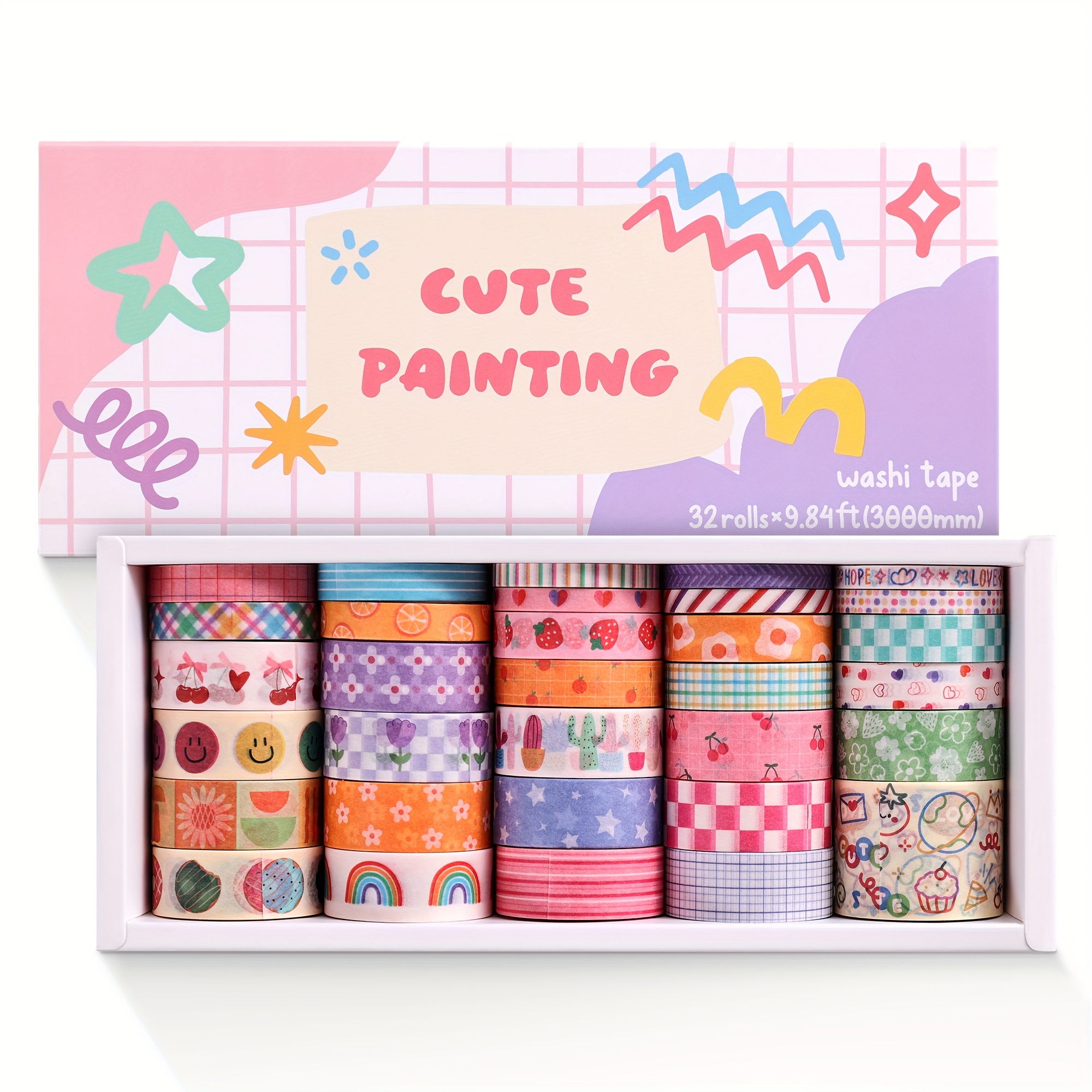 TEMU 32롤 귀여운 플로럴 와시 테이프 세트 - 5-30mm 폭, 9.84ft 길이, 생생한 파스텔 & 컬러, 혼합 패턴 (플로럴, 폴카, , 하트, 별, 원, 스크랩북, 저널링, 여성용 불릿 저널링 용품, 스크랩북 용품)