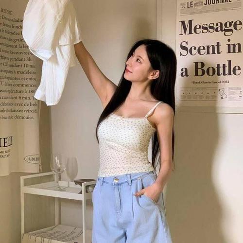 캡 내장 도트 패턴 끈 나시 탑 여름 데이트 룩 코디 WFL0IGQ