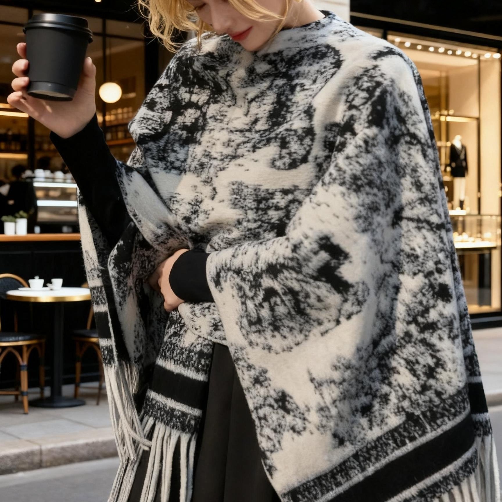 TEMU 새로운 가을-겨울 클래식 패턴 숄 케이프 가디건 여성용, 패셔너블 봄 신상 여성 의류, 클래식 여성 숄 코트, 새로운 가을-겨울 케이프 가디건, 블랙 앤 화이트 패셔너블 다용도 여성 의류, 스타일리시하고 시크한 여성 의류, 연회 저녁 드레스 코트, 실내 에어컨 셔츠, 야외 나들이 탑, 사진 촬영 의류