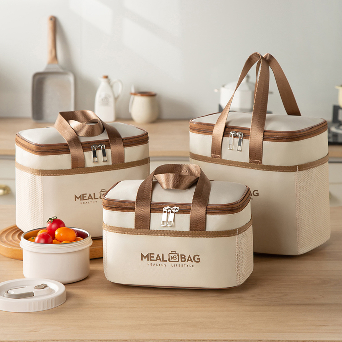 TEMU 3개 들이 단열 도시락 가방 (어깨 스트랩 포함) | 튼튼한 옥스포드 천, 강화 손잡이 및 메시 포켓, 컴팩트한 사각 디자인, 학교, 사무실 및 여행에 적합, 비식품 접촉