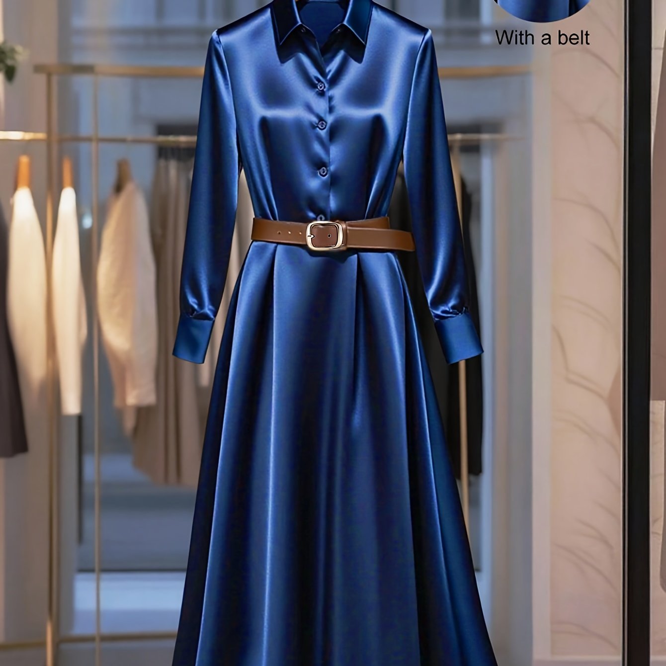 TEMU 가을을 위한 새로운 우아한 새틴 네이비 블루 롱 스커트. 벨트가 특징이며, 도시 여성 드레스 및 가을 야외 우아한 의상에 완벽합니다.