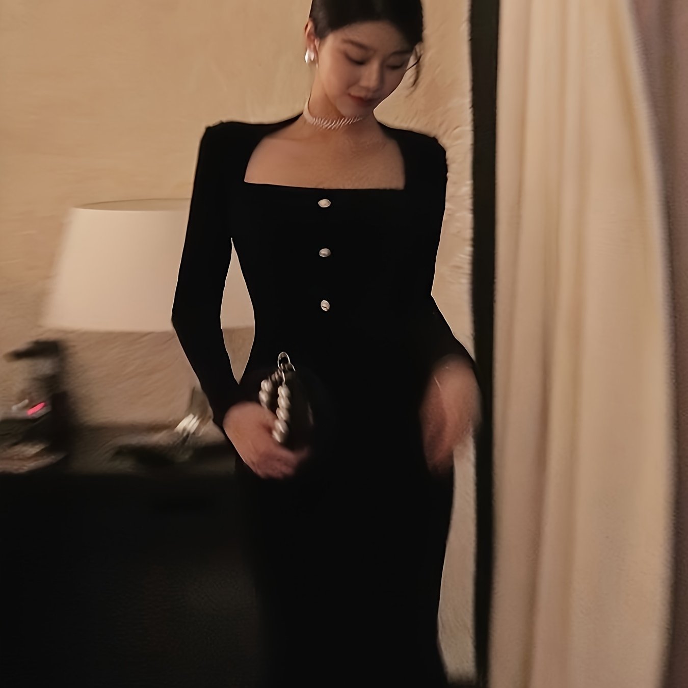 TEMU 여성용 우아한 블랙 & 골드 스퀘어넥 롱 드레스 - 세탁기 사용 가능 가을 겨울 웨딩 게스트 가운, 포멀 파티 이브닝 드레스, 사계절 착용 가능, 바디핏 스커트