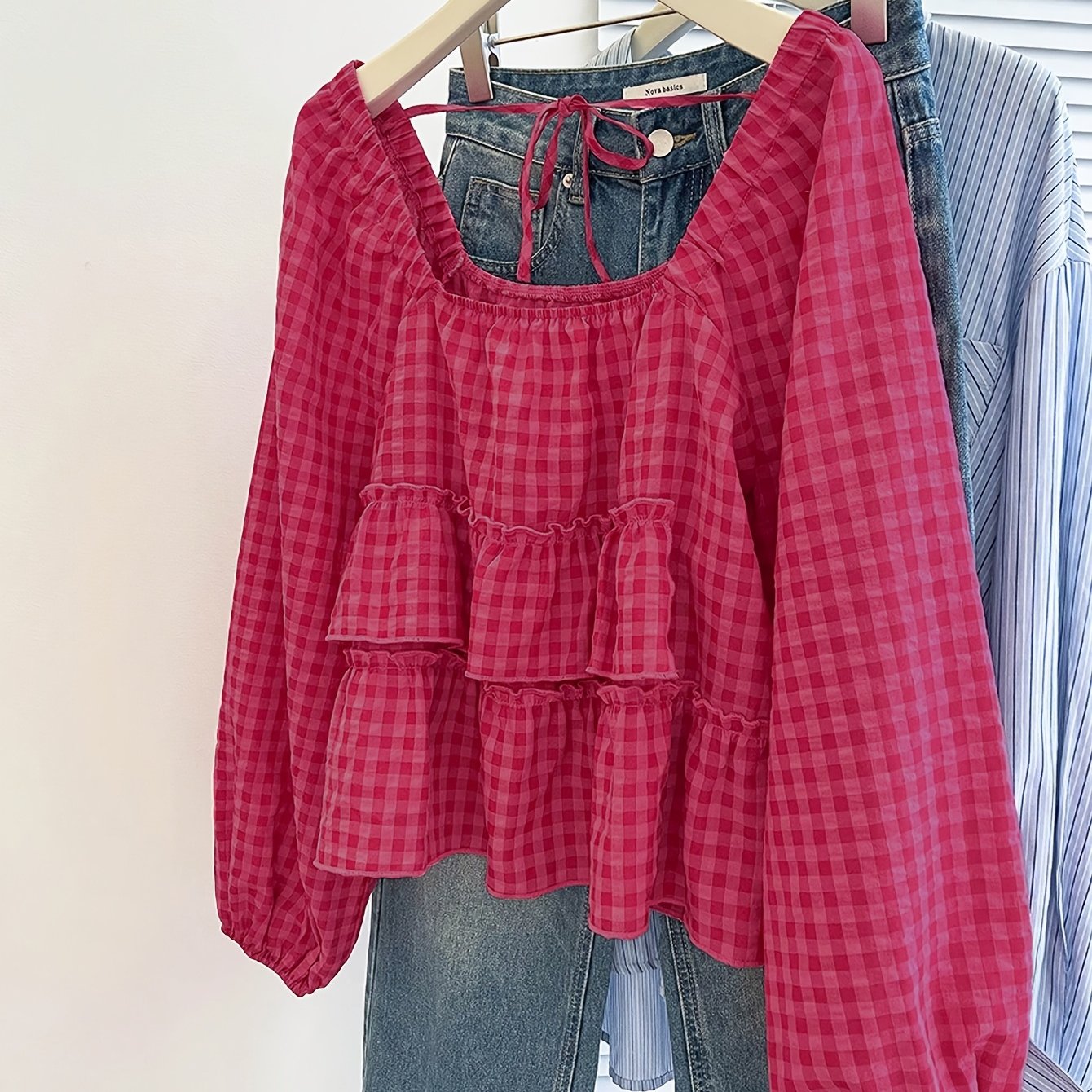 TEMU 여성용 루즈핏 빈티지 스타일 러플 체크 스퀘어넥 퍼프 슬리브 셔츠