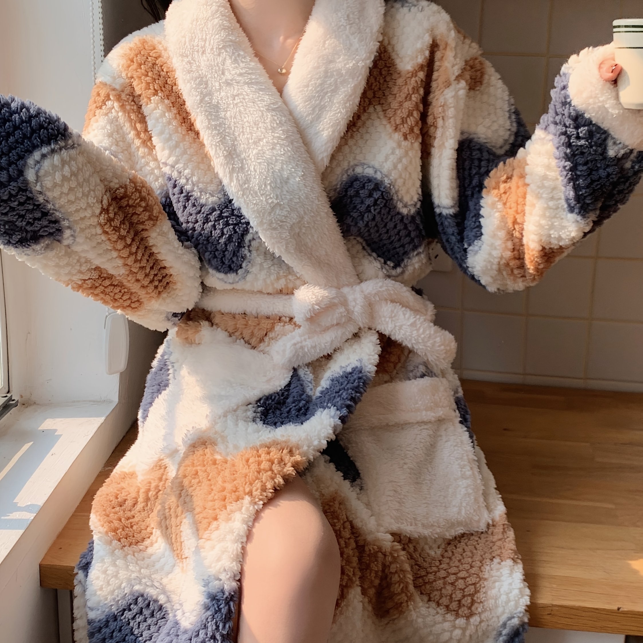 TEMU 엘레강트 체크 프린트 기모노 가운 - 두꺼운 겨울용 스타일 목욕가운, 벨트 포함, 긴 소매 칼라 & 파자마 같은 따뜻함, 세탁기 사용 가능한 아우터웨어 (베이지/블루/브라운/토프)|샤워가운