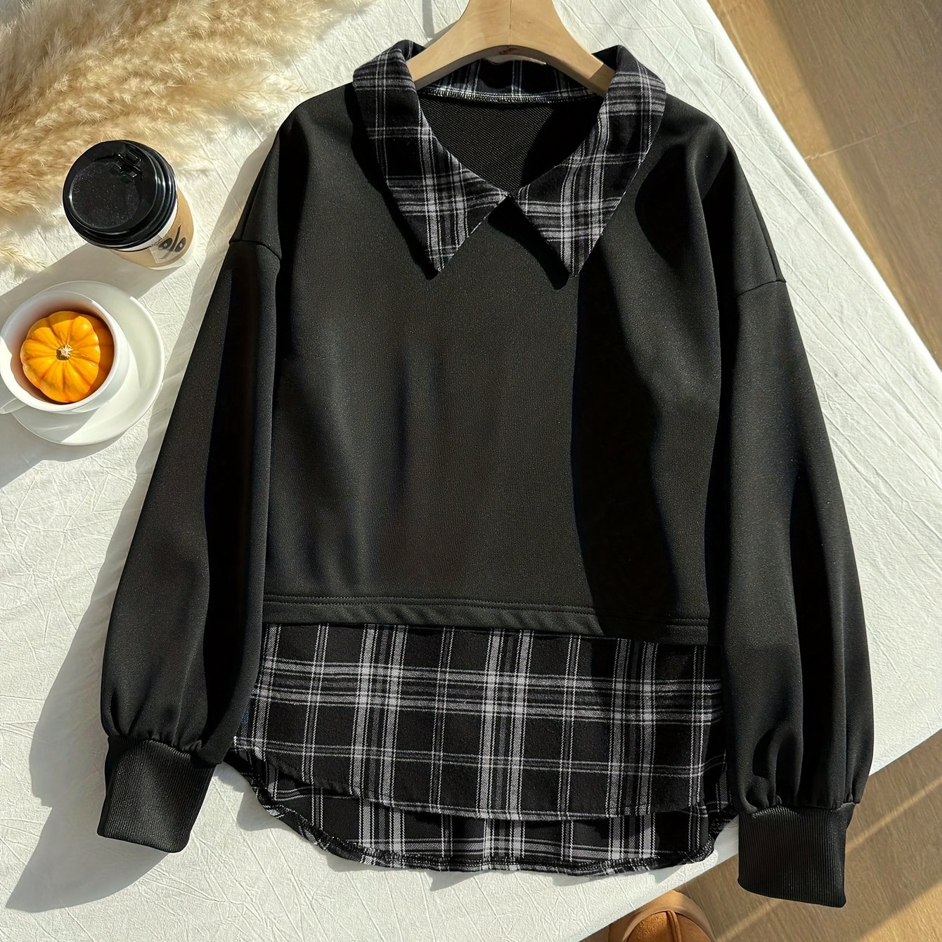 TEMU 플러스 사이즈, 여성용 캐주얼 칼라 체크 패치워크 셔츠, 가을 겨울 출근룩과 스타일, 오피스 및 비즈니스용