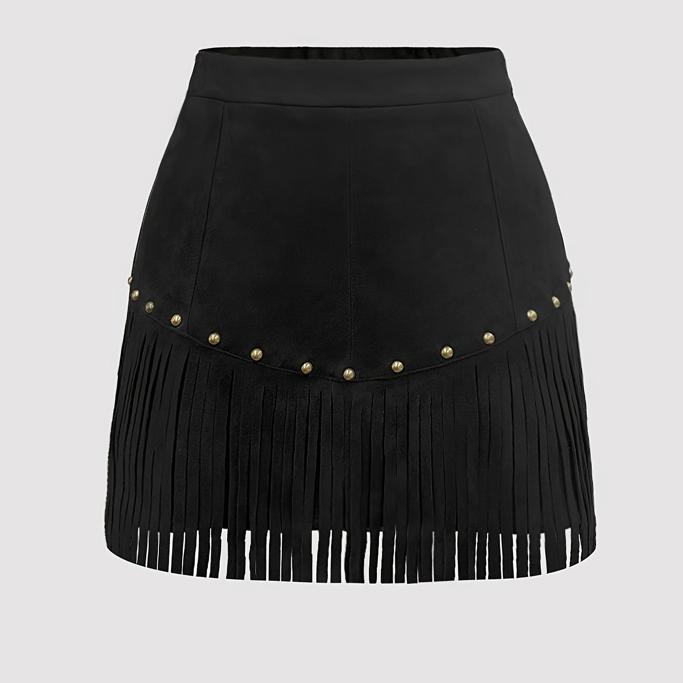 TEMU 여성용 레트로 히피 태슬 블랙 A라인 스커트 - 가을/겨울 캐주얼 짧은 길이 골드톤 스터드 장식, 일반 핏, 나틀 스타일에 완벽한 나틀 스커트 | 레트로 히피 스타일