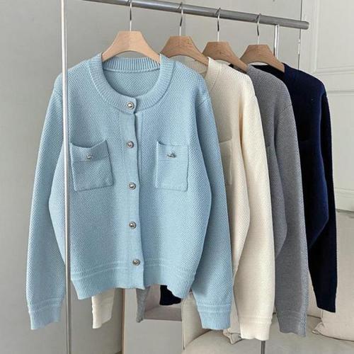 [옷자락]여자 셋업 하늘색 은장단추 주머니 U넥 가디건