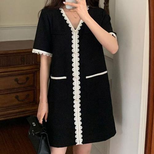 H라인 하객룩 원피스 데이트룩 반팔 트위드 미니 버튼
