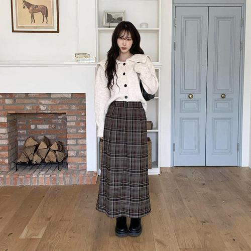 [옷자락]여성 겨울 출근용 체크 H라인 롱스커트 뒤트임 빅사이즈