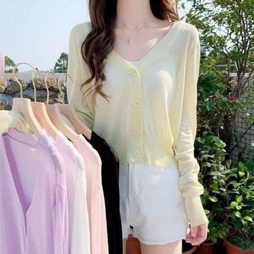 [에이치플러스몰]여성 인기 파스텔톤 여름 긴팔 감성 브이넥 가디건 얇