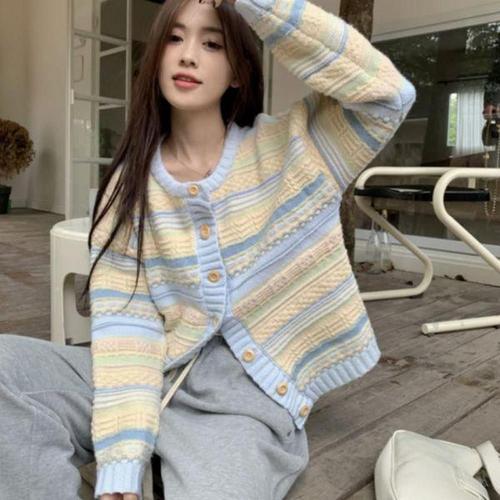 [에이치플러스몰]스트라이프 배색 파스텔 라운드넥 여성 가디건 긴팔가디건