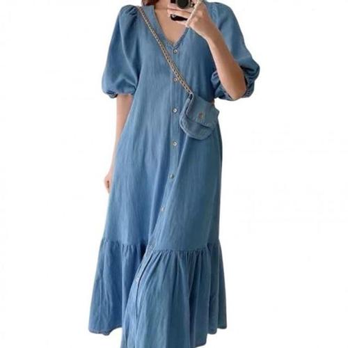 [옷자락]여성 데일리 퍼프소매 포켓 데님 반팔 롱 원피스