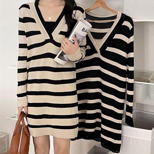 니트 원피스 단가라 브이넥 배색 패턴 펀칭 데일리 WAE9E05