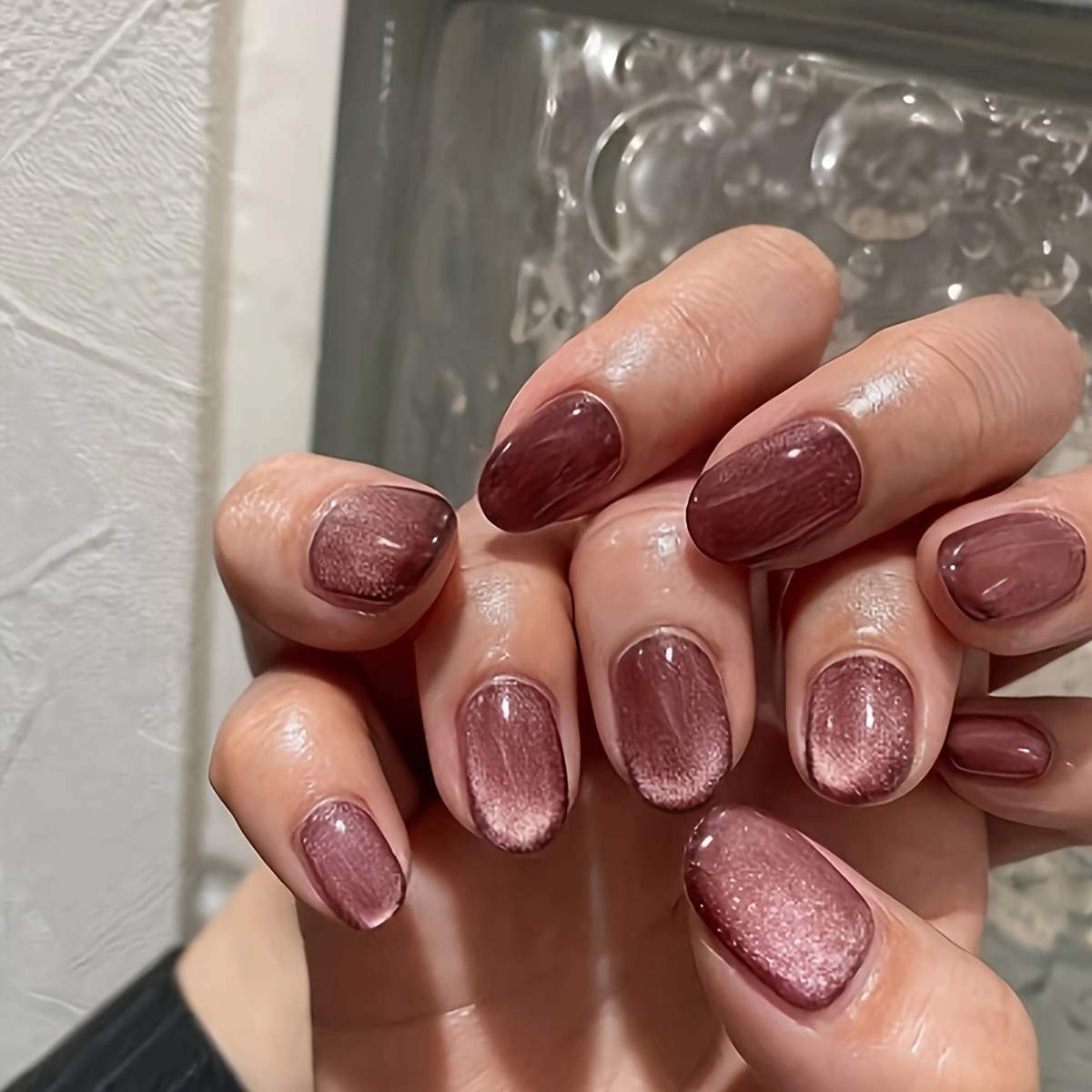 TEMU 24개 로즈 레드 오벌 캣 아이 프레스온 네일 - 광택 마감, 짧은 길이, 파티 및 이벤트에 완벽, 고양이 애호가 선물