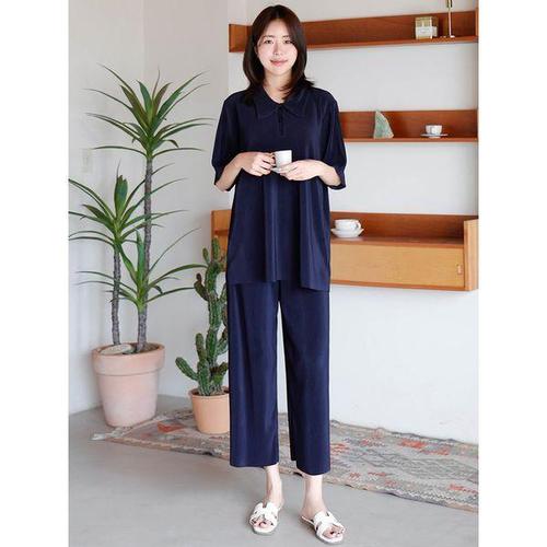 [드리다]여성 여름 플리츠 카라 티셔츠 와이드 밴딩 팬츠 빅사이즈 상하셋트 셋업 40-50대 미시 엄마옷