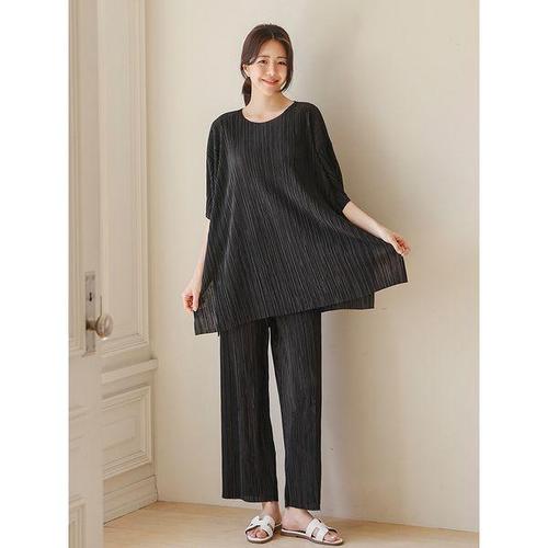 [드리다]여름 가오리 루즈핏 빅사이즈 플리츠 티셔츠 와이드 팬츠 상하셋트 셋업 캐주얼 미시 등원 모임