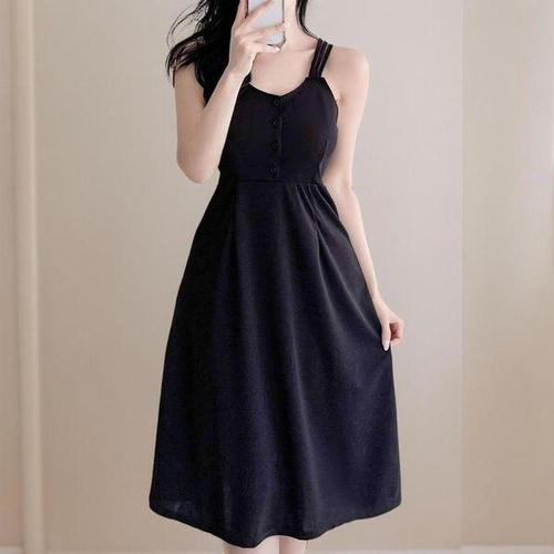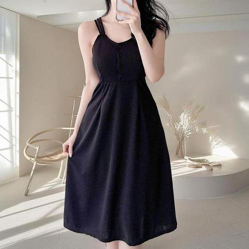 [옷자락] 여성 블랙 하트넥 어깨끈 플레어 나시 롱 원피스