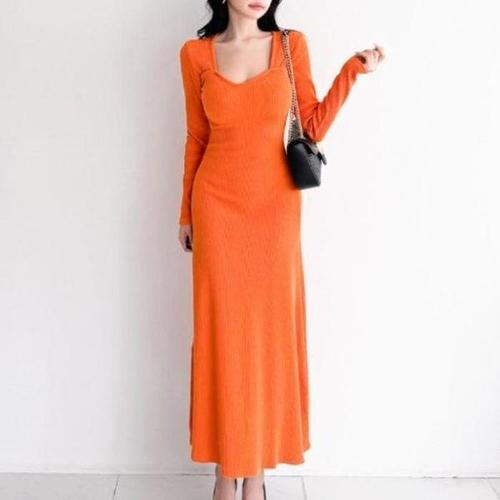 [옷자락]여성 하트넥 골지 슬림핏 긴팔 롱 원피스
