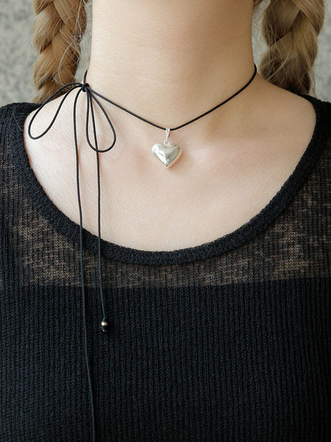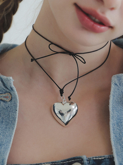[제이로렌] Jumbo Bold Silver Heart Leather Long Necklace N01151
