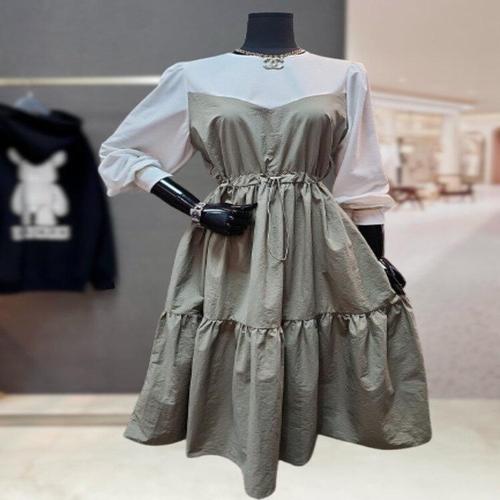 [비바앤코코넛]배색 볼륨 소매 허리 스트링 원피스