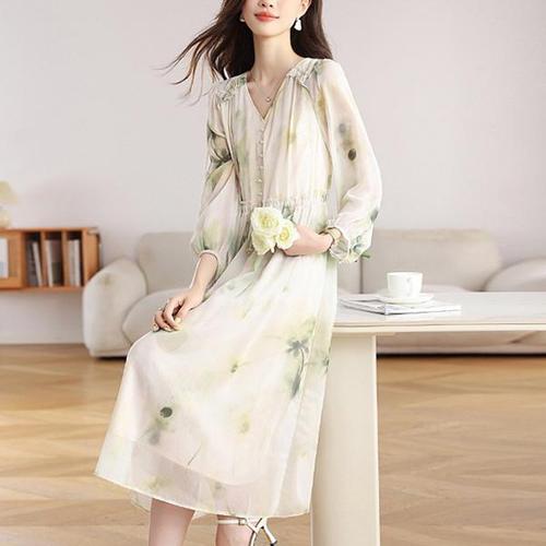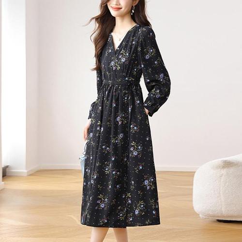 [샵앤]봄신상 여성 V넥 허리스트링 2단 캉캉 꽃무늬 긴팔 롱 원피스 TH-U-WDR-20274-아이보리