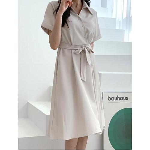 [위시드]모던 카라넥 리본 미디 프릴 반팔 원피스 (WIBBOP040)