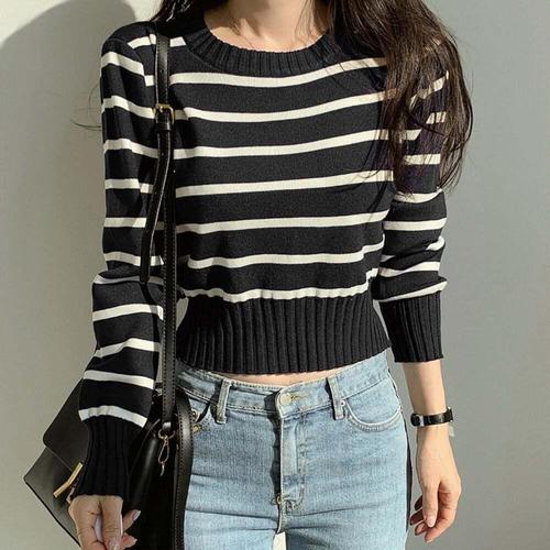 [셀럽하우스]검정 MUEH8349 흰색 스트라이프 패턴 크롭티 골지 니트 긴팔티