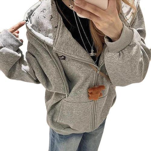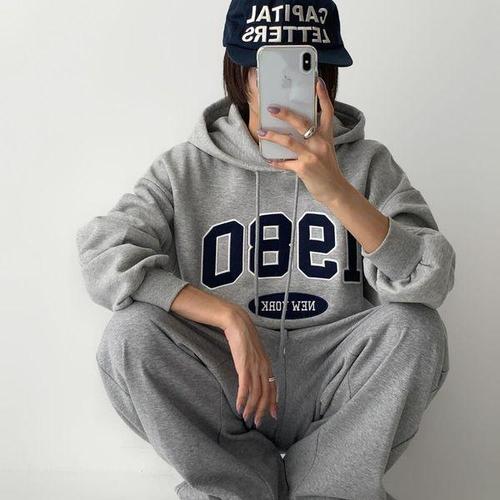 [신상오픈런]여성용 겨울 후드 티셔츠 회색 포켓 자수 캠퍼스 스타일