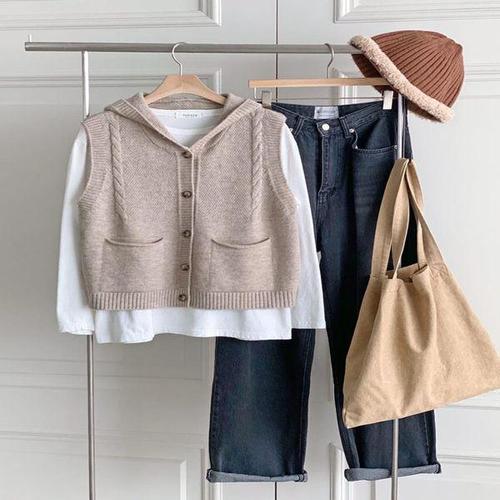 [신상오픈런]여성 후드 단추 니트 베스트 더블포켓 꽈배기 디자인