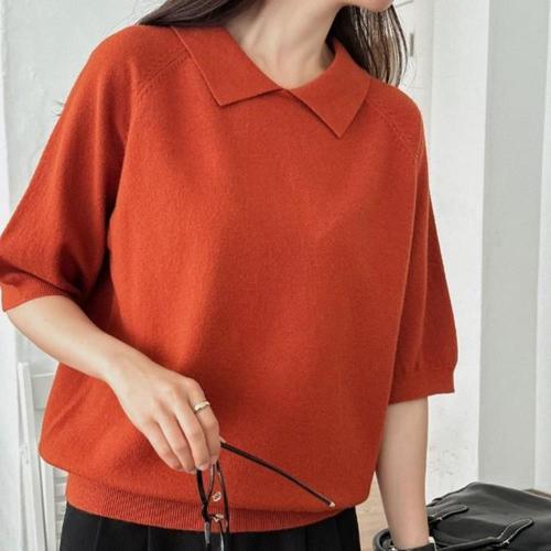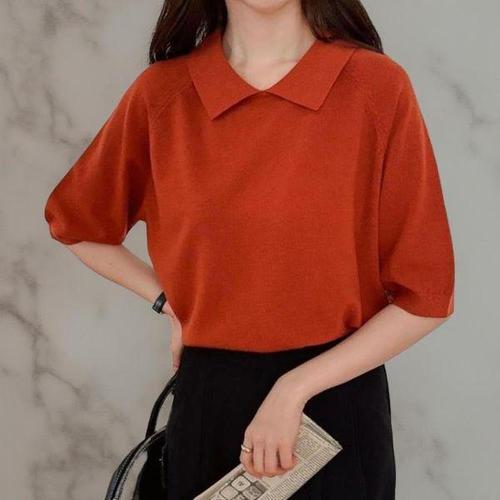 [옷자락]여성 일상용 절개 디자인 카라넥 반팔 울 니트 5부
