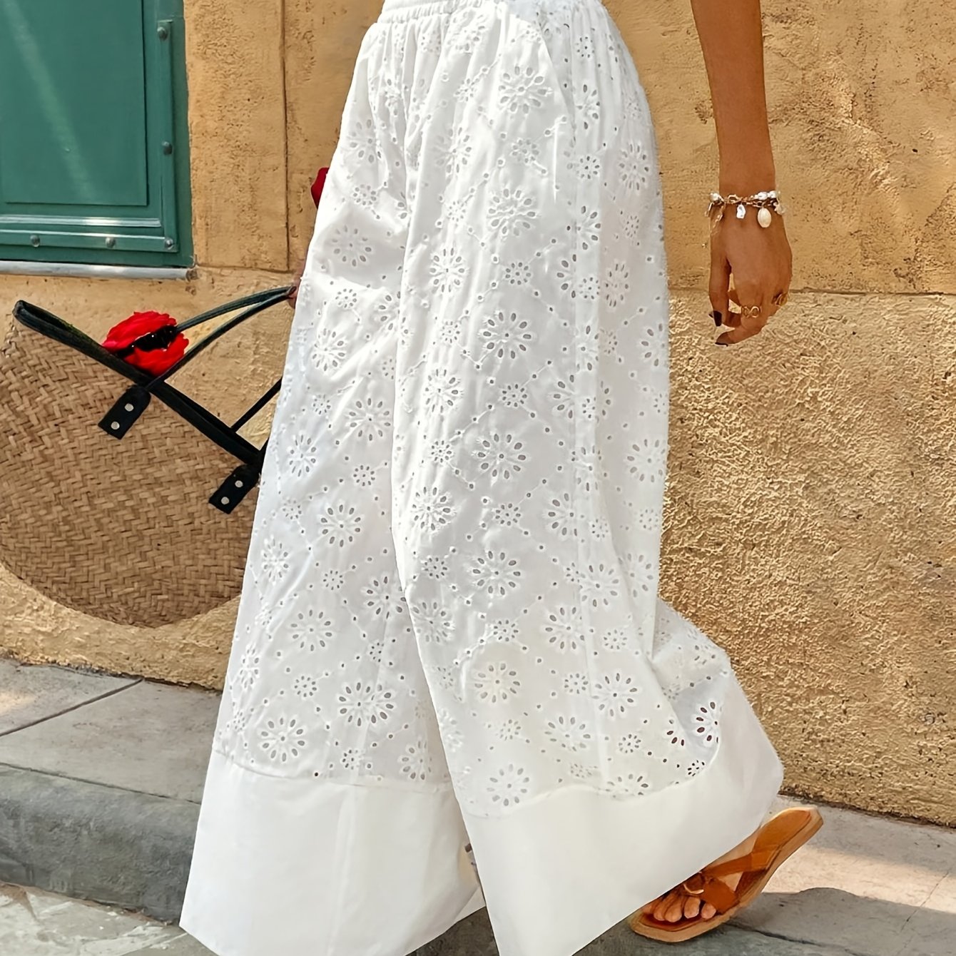 TEMU 플러스 사이즈 - 우아한 플러스 사이즈 여성 패션 루즈 솔리드 컬러 와이드 레그 팬츠 | 아이렐 자수, 신축성 없는 원단, 해변 및 캐주얼 외출에 적합