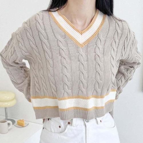 [셀럽하우스]배색 LTBY6478 디자인 여자 브이라인 꽈배기 크롭니트