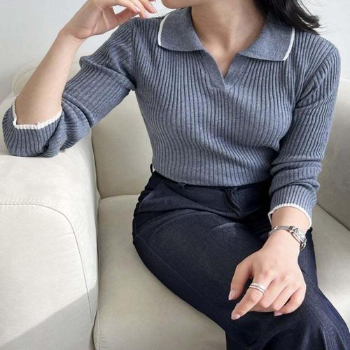 [WPBG]단정 브이 카라 라인 심플 긴팔 니트_4color