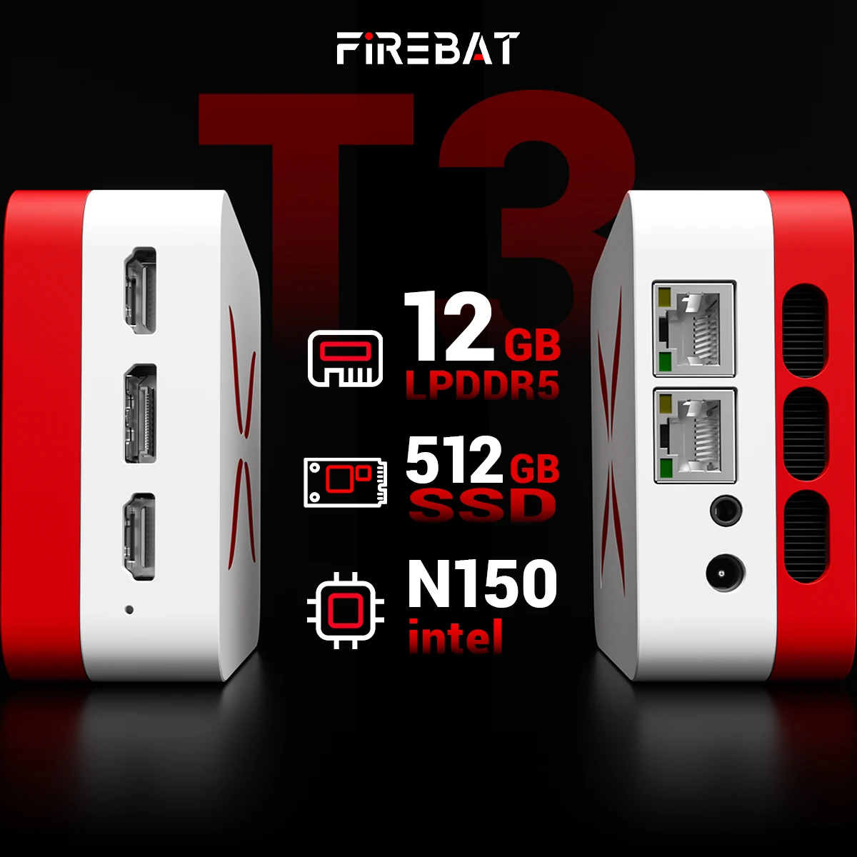 파이어뱃 T3 미니 PC 인텔 N150 컴팩트 사이즈 윈도우 11 프로 12GB LPDDR5 RAM 512GB PCIe SSD WiFi 5 BT4.2 듀얼 RJ45 트리플 디스플레이