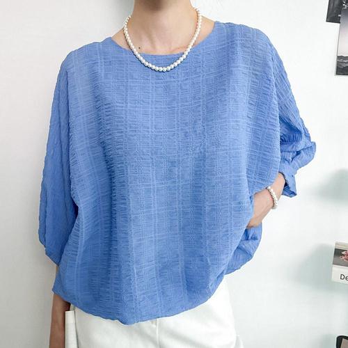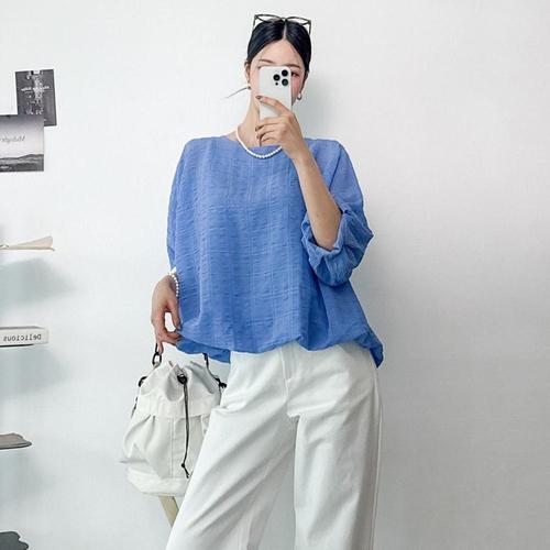 여성 라운드넥 지짐 쿨링 루즈핏 벌룬소매 6부 블라우스 CAT-WBL-4456-블루