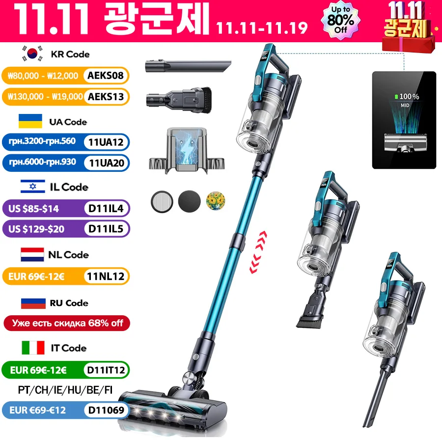 핸드헬드 무선 진공 청소기 550W 50KPa 가정용 전기 빗자루 LED 터치스크린 탈착식 배터리 경량 스틱 청소기