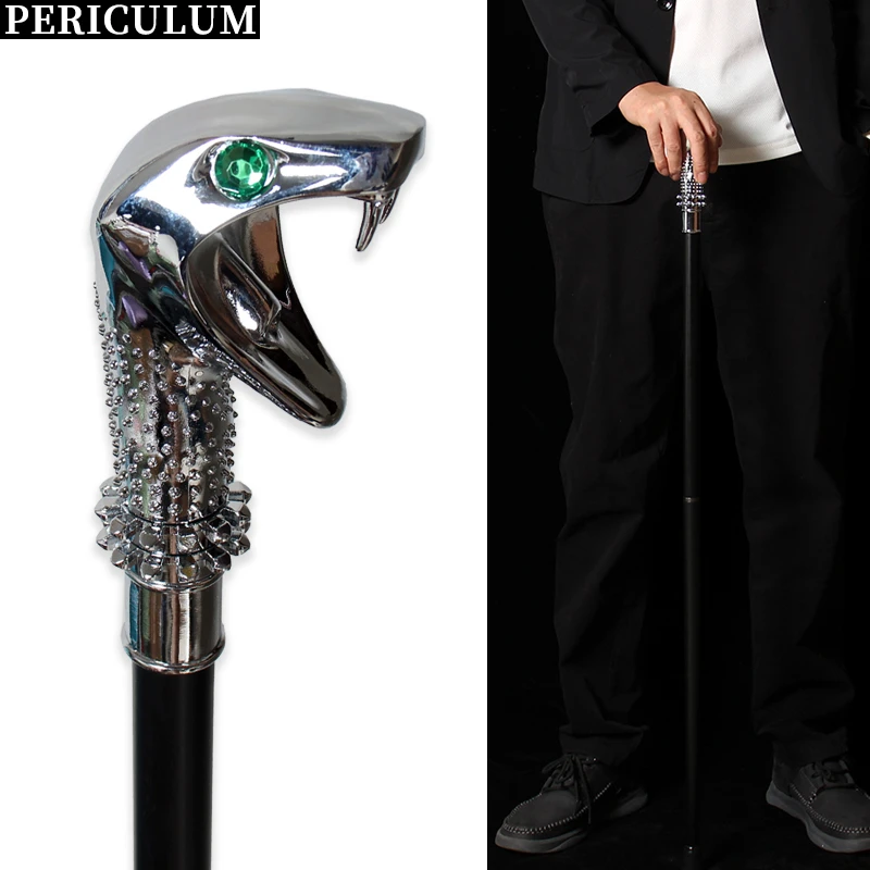밝은 은색 코브라 머리 지팡이 여성용 뱀 디자인 녹색 눈과 돌출된 가시가 있는 스타일리시한 남성용 지팡이