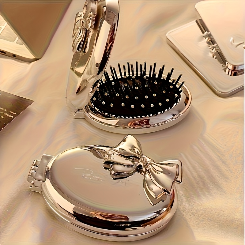 TEMU 2가지 색상 - 미러가 있는 리본형 미니헤어빗, 휴대용 접이식 에어쿠션빗 (여성용), 일반모발에 적합한 그루밍스타일, 여행하기 좋은 헤어스타일링 도구, 통합된 거울로 언제든지 메이크업 수정